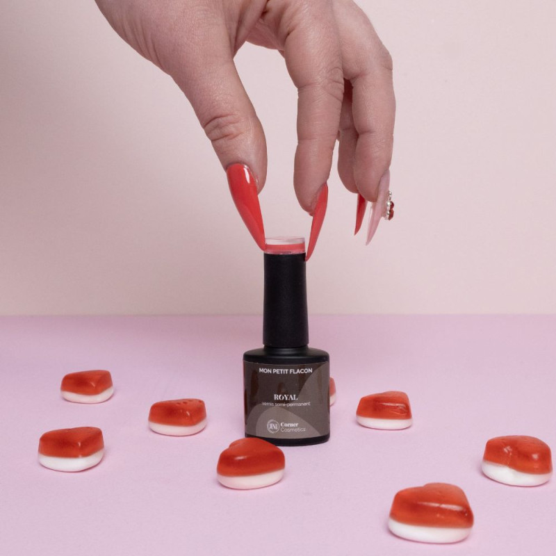 Laissez vous séduire par la couleur "Royal". Ce vernis semi permanent rouge avec des reflets rosés sera parfait pour une pose romantique.